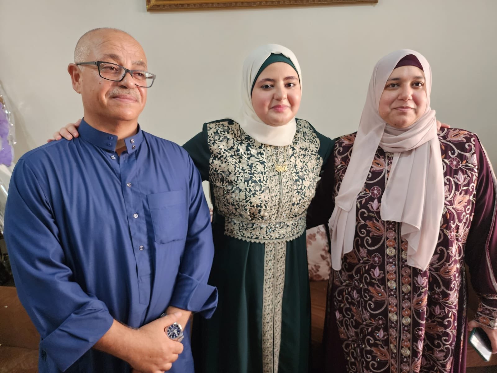 (Dr. Essa with his wife and daughter, Shahd, who ranked first in Palestine in the university qualifying exams in the sciences (2023)